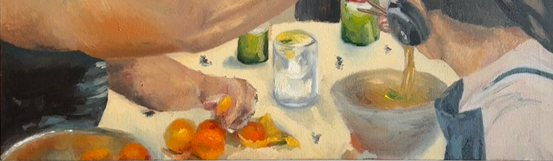 As the painting developed, I realized my focus had shifted. What started as a landscape transformed into a depiction of connection and intimacy. The painting may suggest a story about belonging, or it might evoke feelings of isolation and loneliness, like me with my headphones on. Paintings often reveal their true meaning over time, and "Family Matters" is no exception, offering a canvas for various interpretations and reflections.